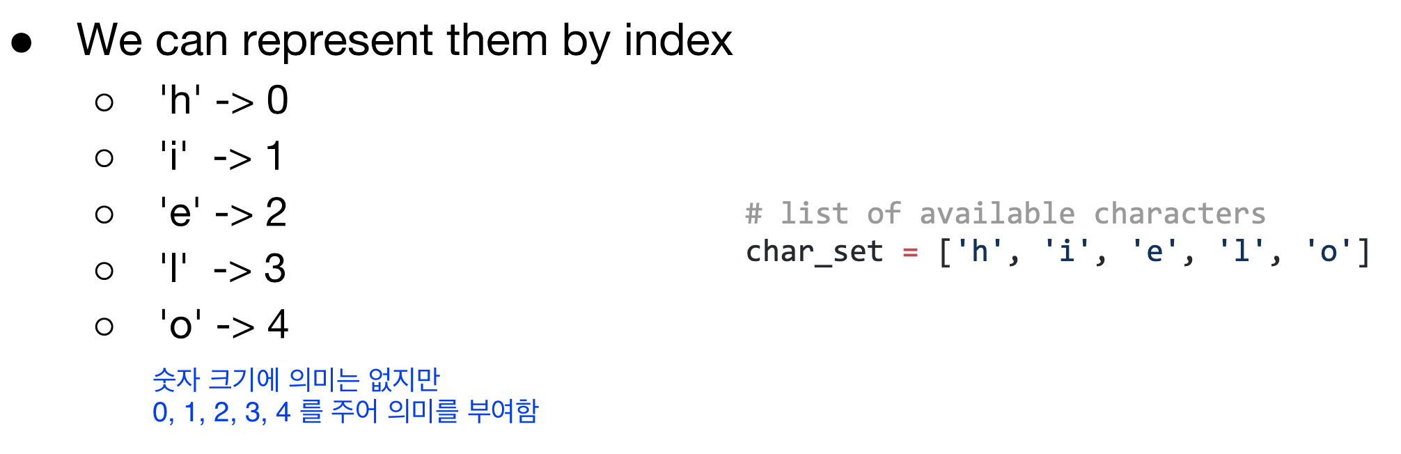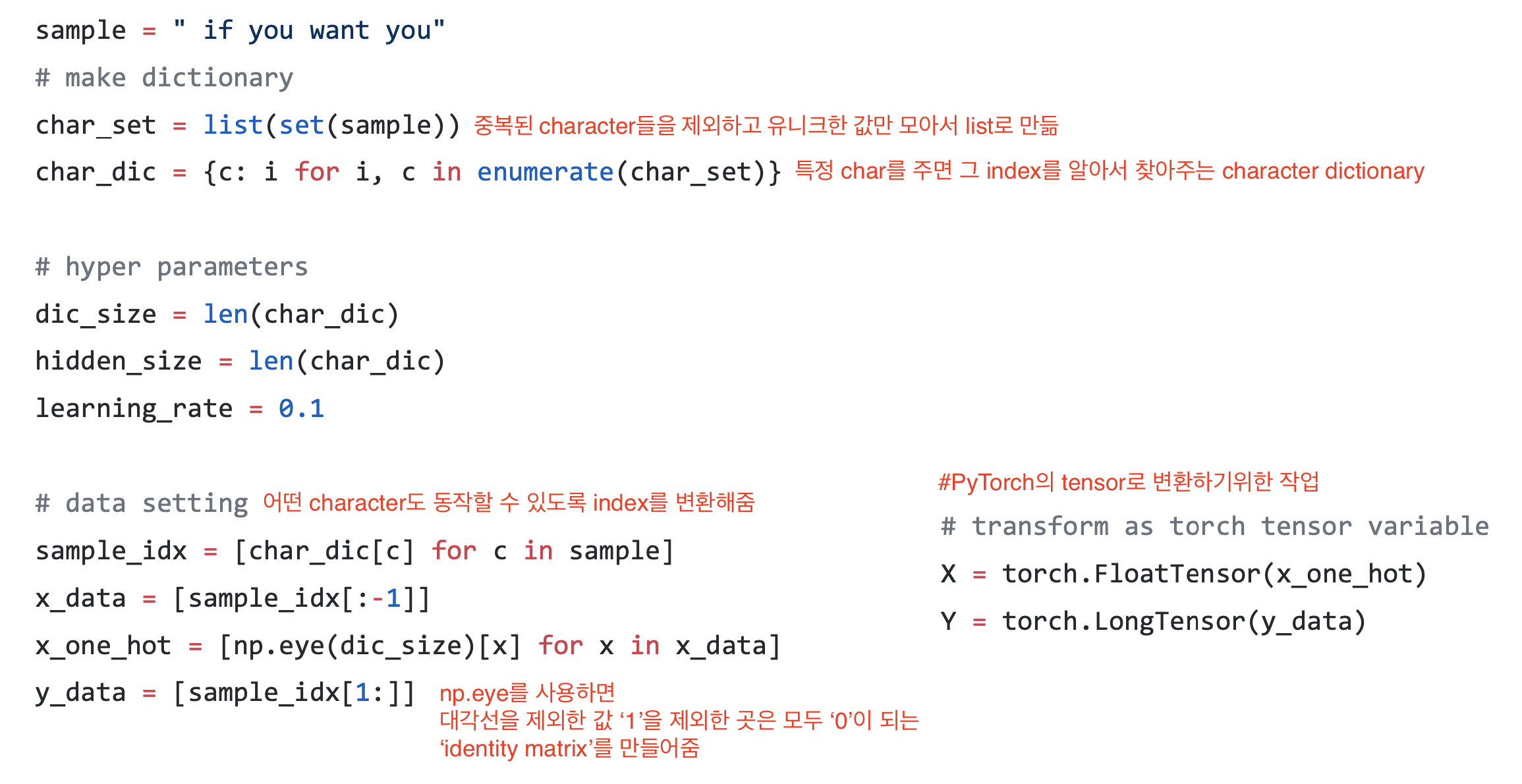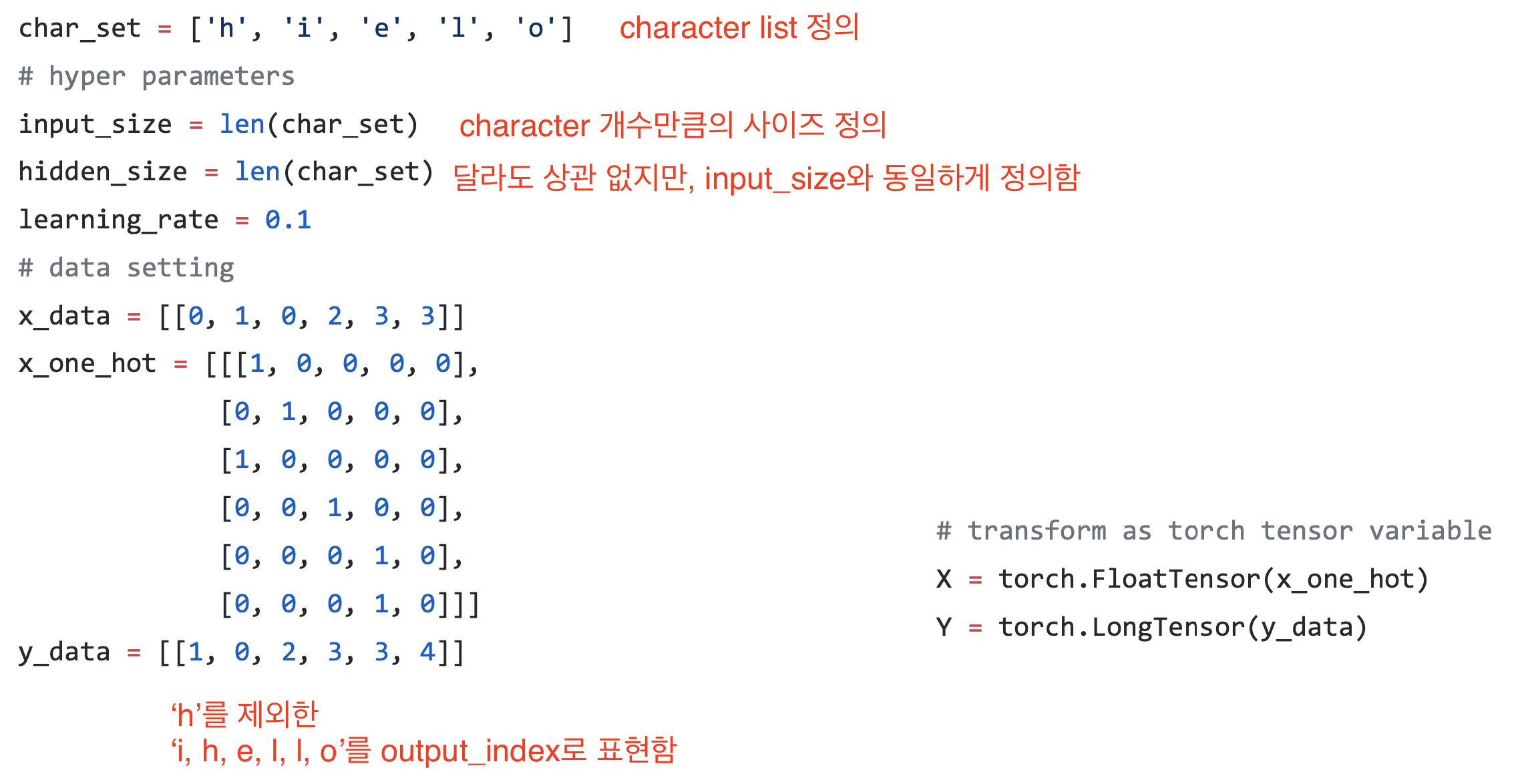 continuous하지 않고 categorical한 데이터를 표현할 때 주로 one-hot encodding을 사용한다. 이 모델은 다음 문자를 예측하는 모델이기 때문에, ‘o’는 제일 마지막이므로 x_one_hot에서는 고려하지 않는다.
