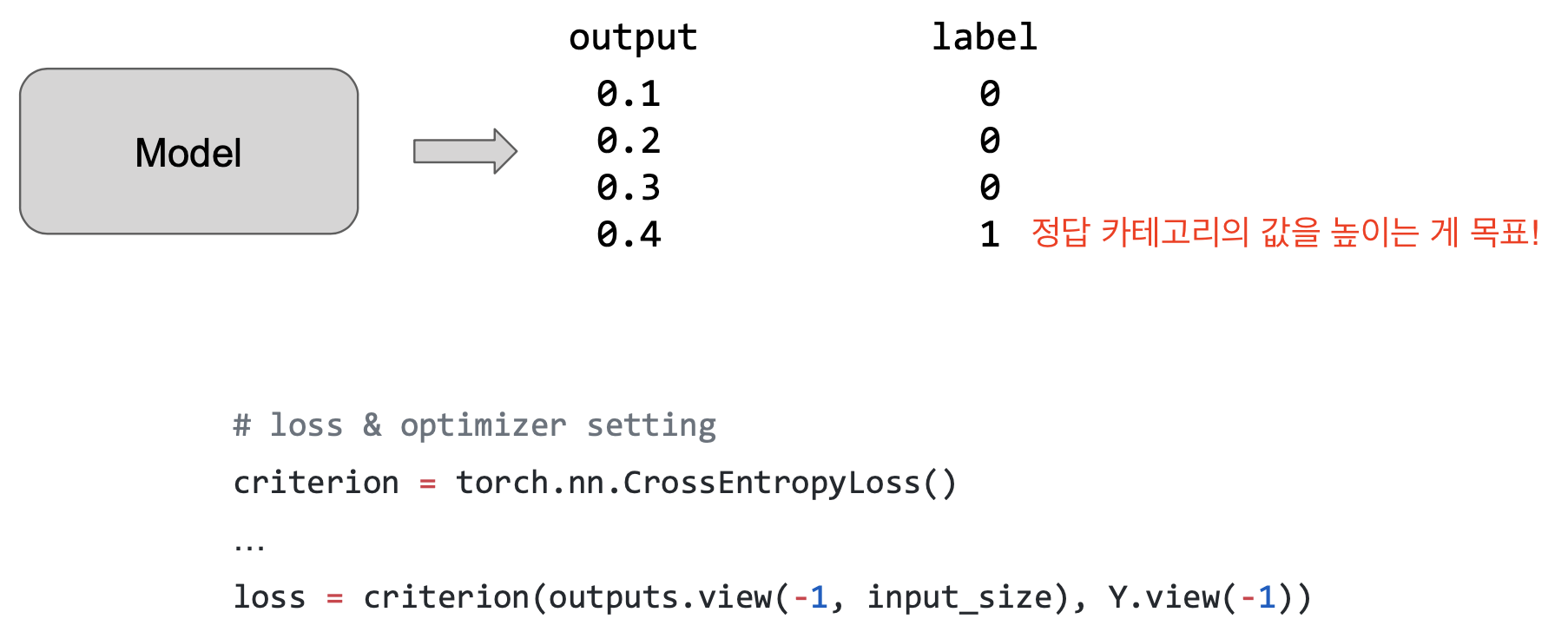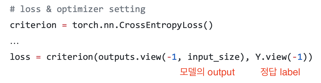 이 예제에서는 CEL(cross entropy loss)라는 loss를 사용한다. Cross entropy loss는 categorical한 output을 예측하는 모델에서 많이 쓰인다.