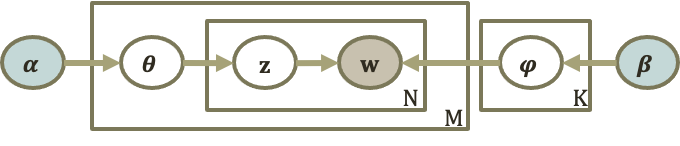 - φ : 토픽의 개수로, 단어가 등장할 확률 (per-corpus topic distributions, 말뭉치 k의 토픽 분포)