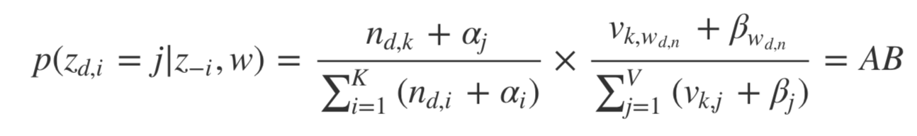 LDA 모델에서는 Collapsed Gibbs Sampling 방법을 이용하여 z를 구한다. 이 방법에서는 구하고자 하는 변수(zi) 외 나머지(z-i)는 모두 고정한 뒤, 불필요한 일부 변수는 샘플링에서 제외한다.