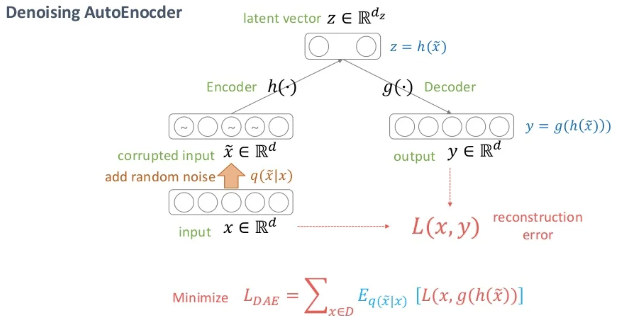 입력값에서 노이즈(random noise)를 추가한 corrupted input값으로 Encoder -> Latent vetcor -> Decoder 과정을 거치고, 출력값은 노이즈가 추가되기 전인 입력값과의 차이를 최소한으로 하는 과정을 하게 된다.